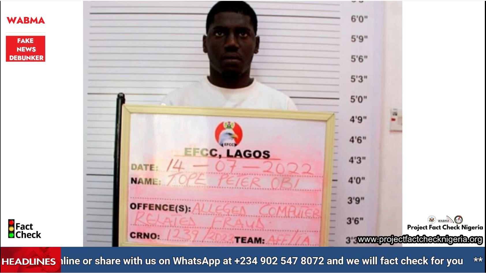 The claim was accompanied by a mugshot of a young man with the name Tope Peter Obi.