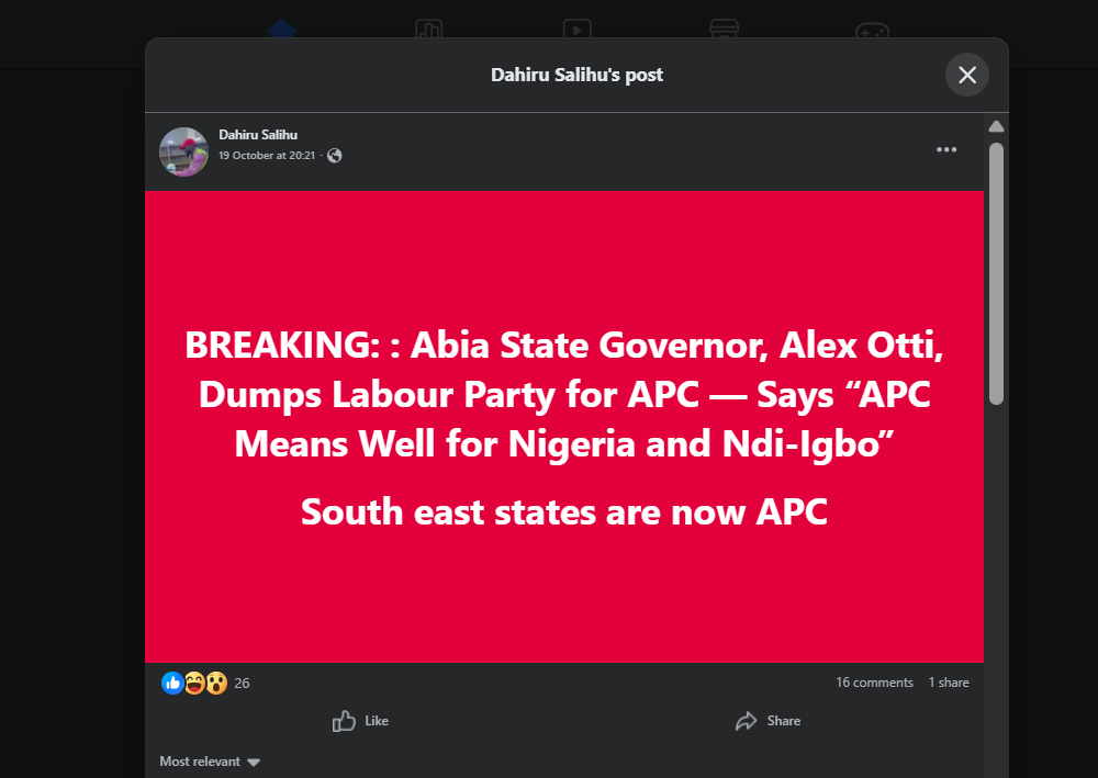 Social media was abuzz recently with a viral post that left many Abians speechless. “Alex Otti has dumped the Labour Party for APC,” screamed a Facebook post, complete with the hashtag #ViralNewsToday. For some, it sounded believable — after all, defections are not unusual in Nigeria’s political space, with the recent defection of the Governor of Enugu State. But did the Abia State governor truly switch camps?