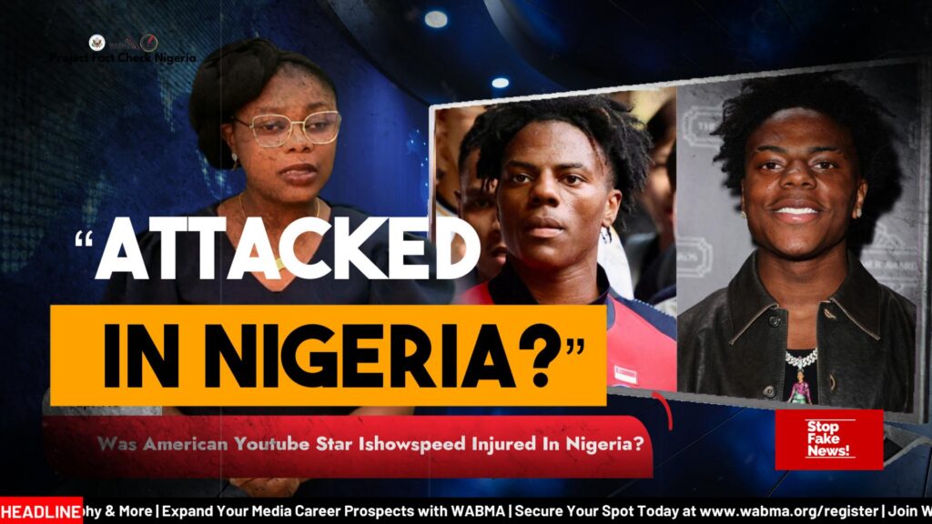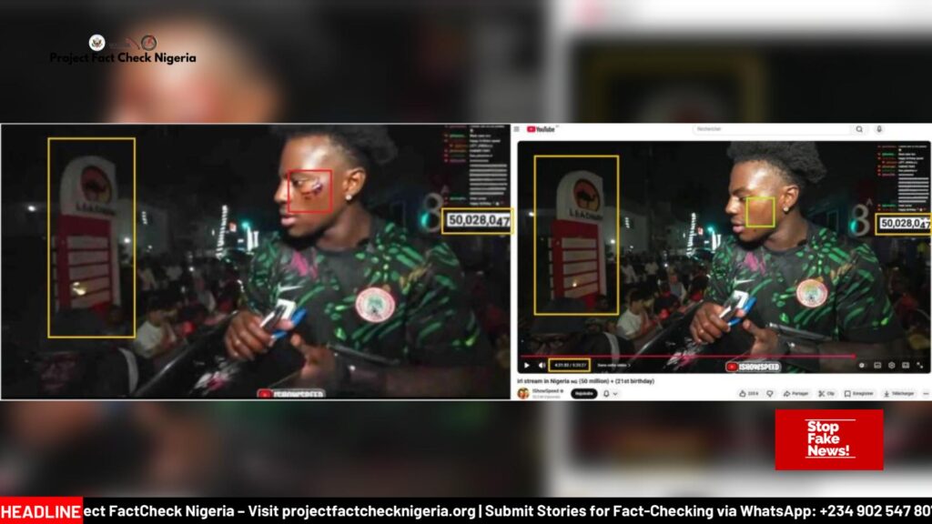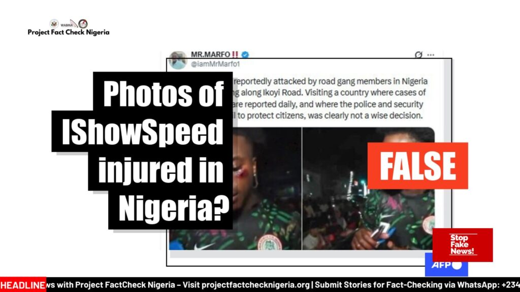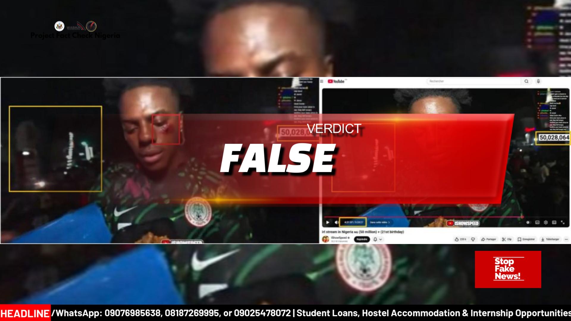 A troubling image circulating online shows American YouTube star IShowSpeed wearing a Nigerian jersey. His face appears bruised. The caption is alarming. It claims he was attacked by road gang members in Nigeria while livestreaming along Ikoyi Road, Lagos. It suggests that visiting Nigeria was unsafe. It paints a picture of chaos.