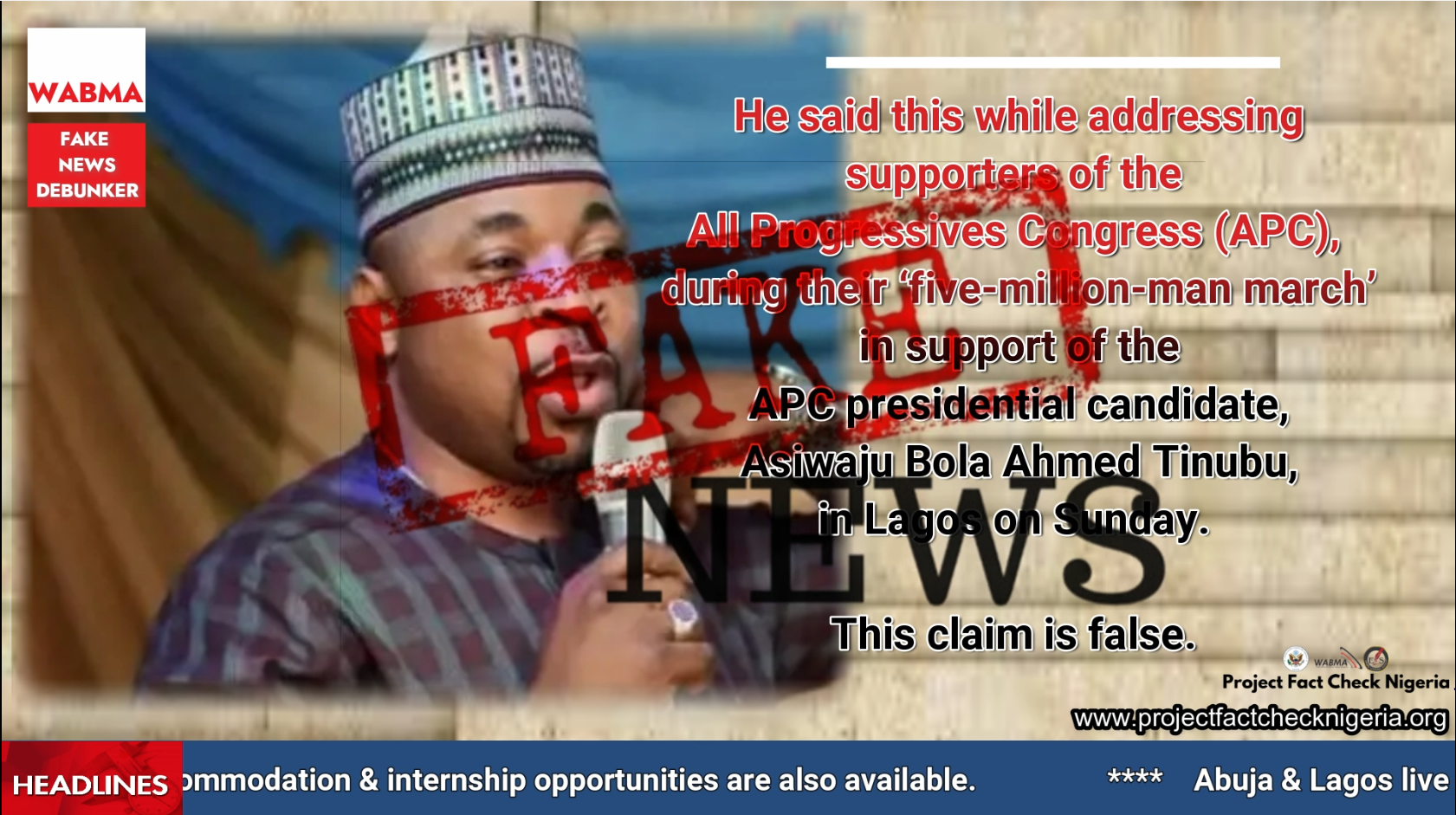 He said this while addressing supporters of the All Progressives Congress (APC), during their ‘five-million-man march’ in support of the APC presidential candidate, Asiwaju Bola Ahmed Tinubu, in Lagos on Sunday. This claim is false.